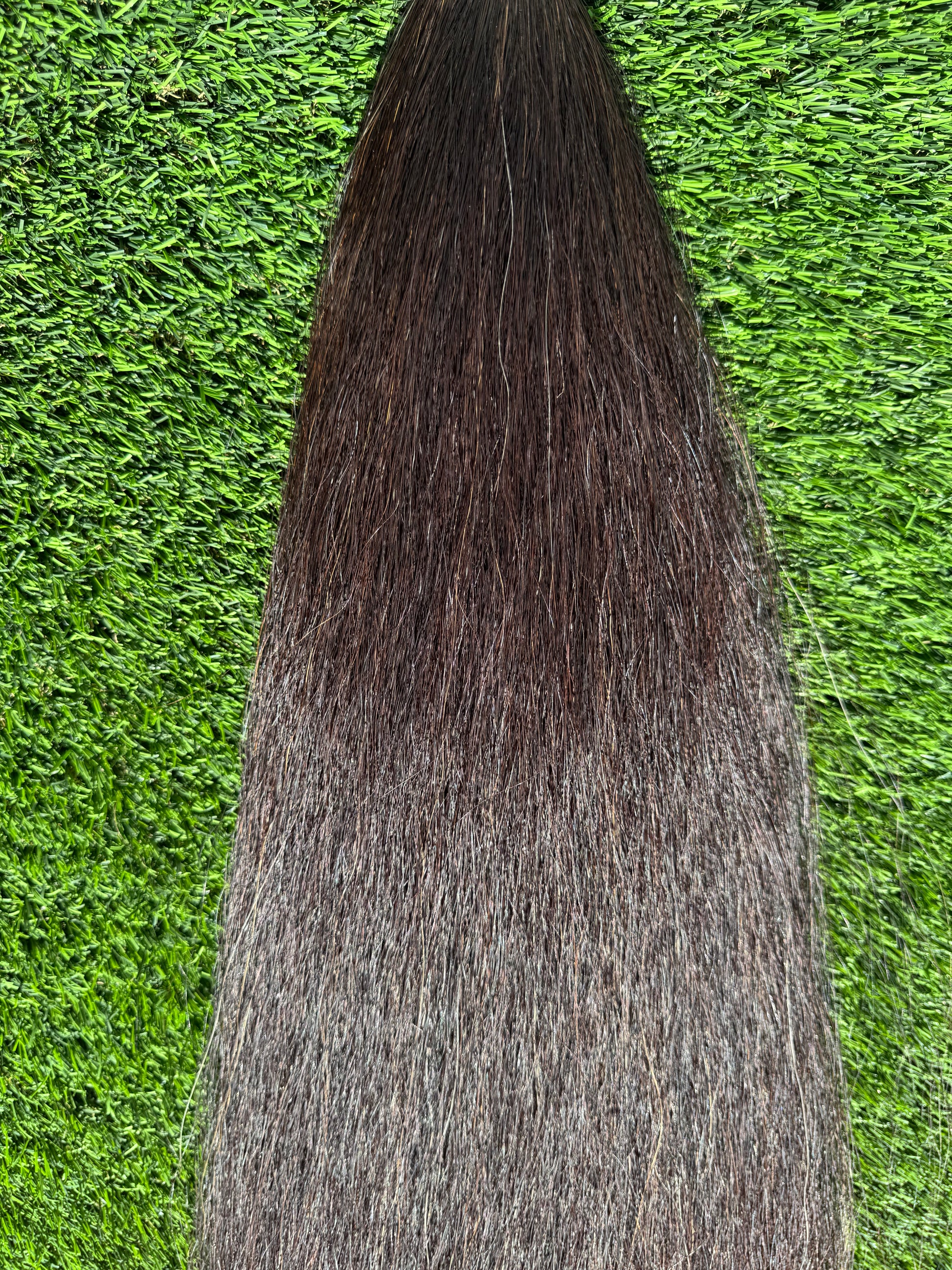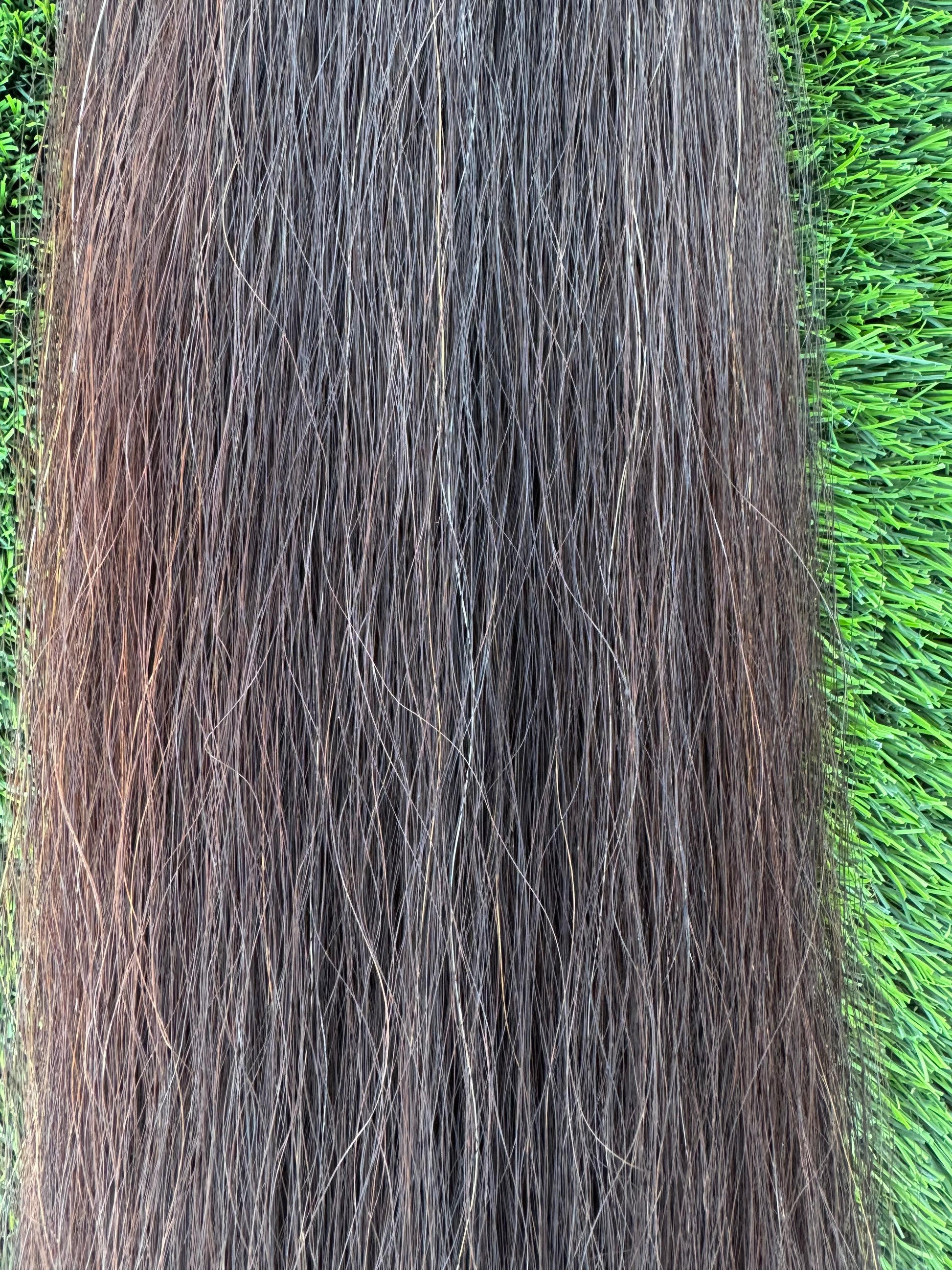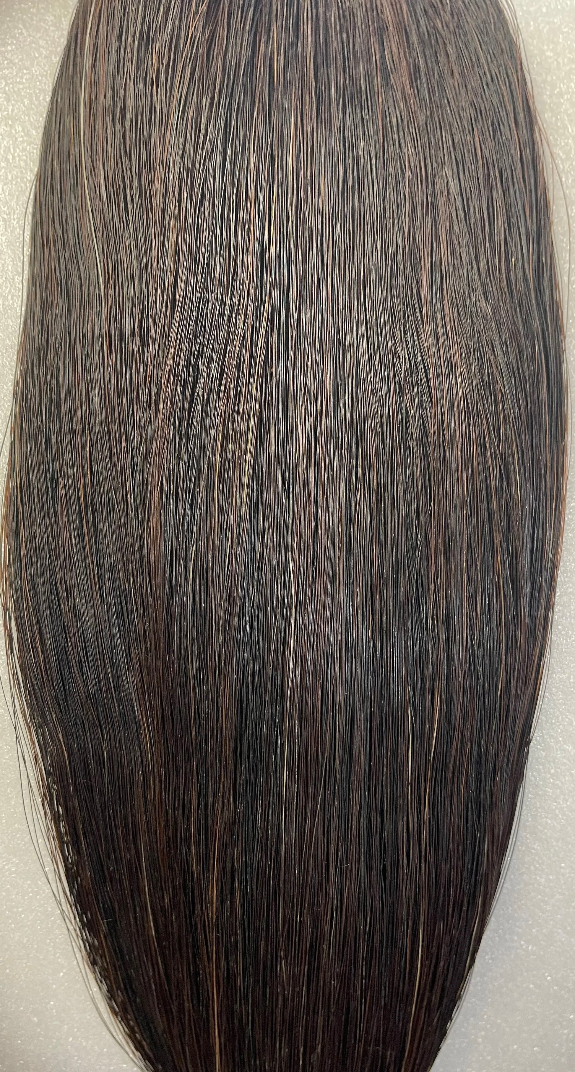 Blend of black and brown hairs making an overall dark brown tail extension. 1.5 lbs of hair, 36” long. Has weight setup. Weights are sold separately.
