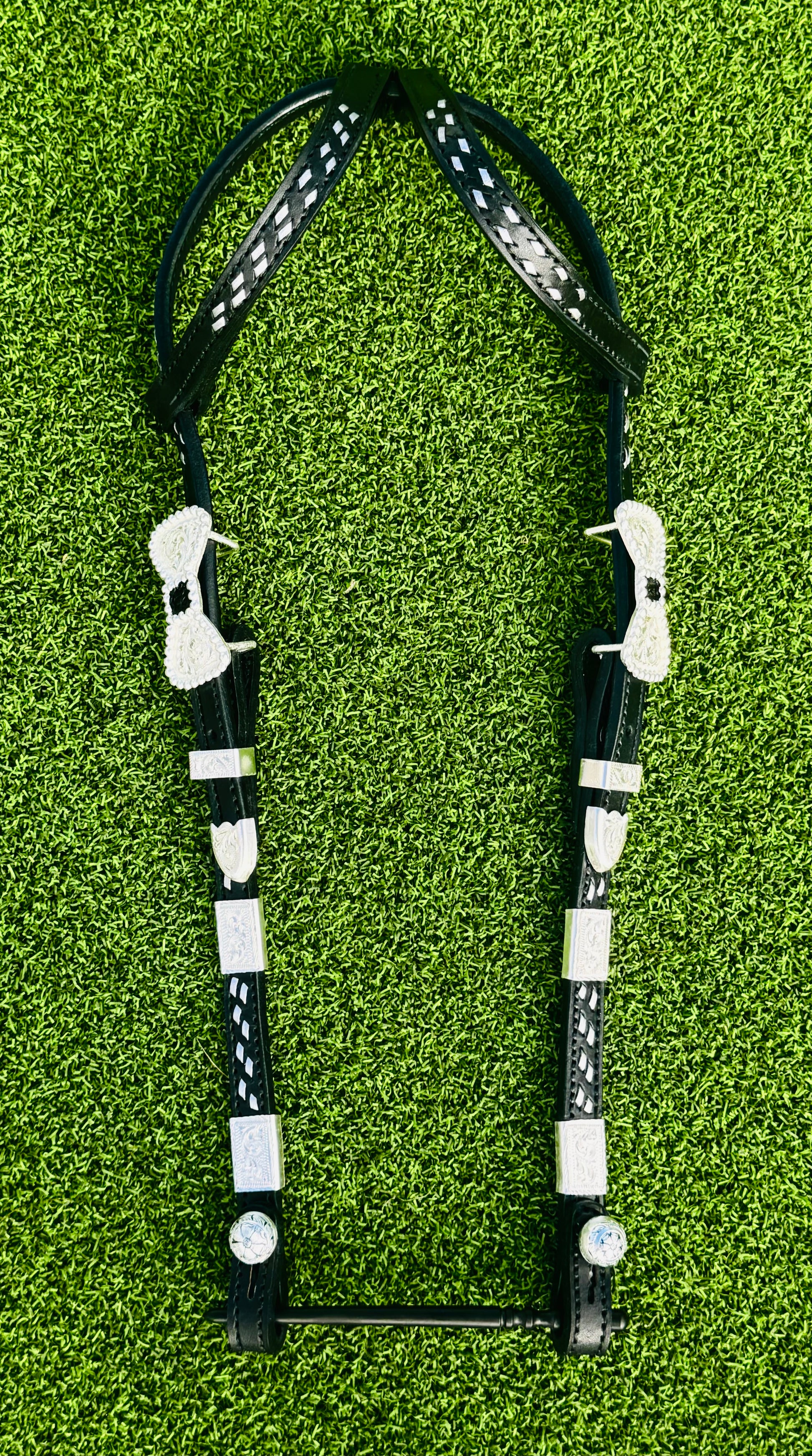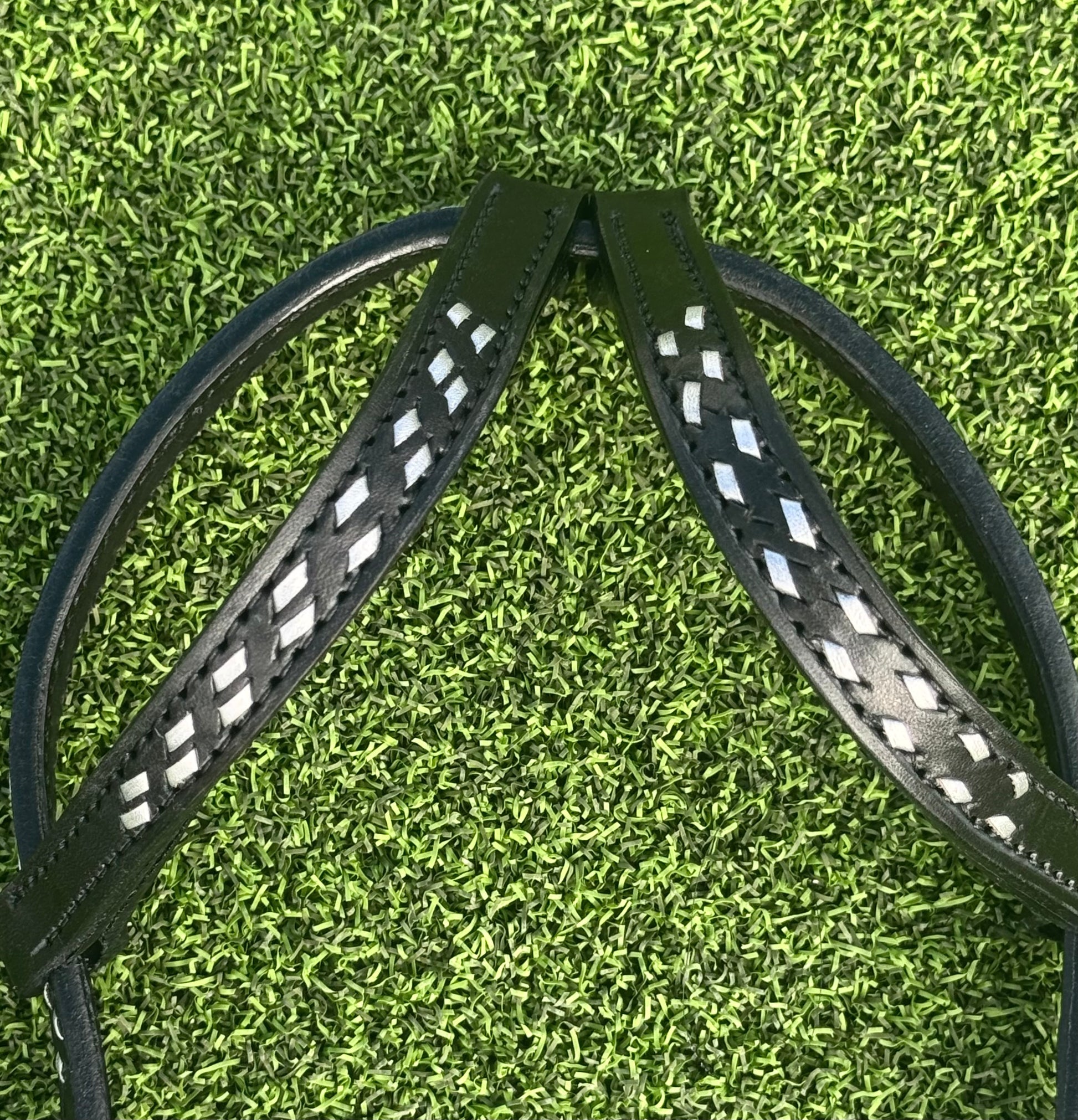 Black herman oak leather with metallic silver kangaroo buckstitch. German silver hardware. Average horse size.