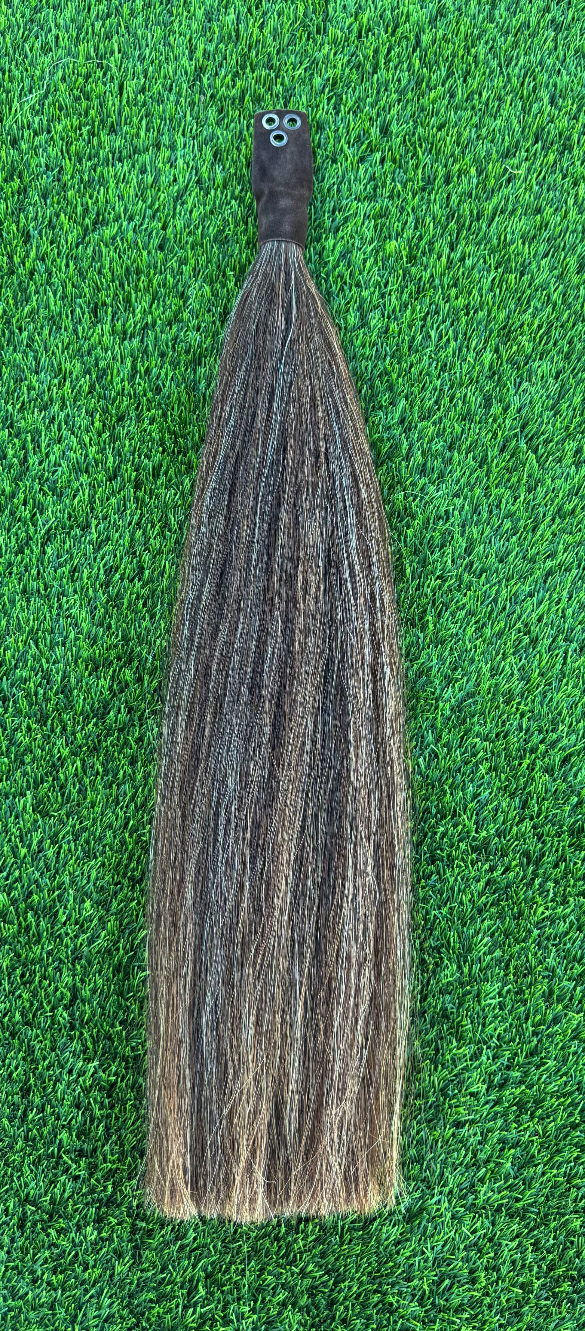 Mixture of black, brown and some white. One lb of hair and 32” from where it attaches to the end of the tail. This is setup for weights.