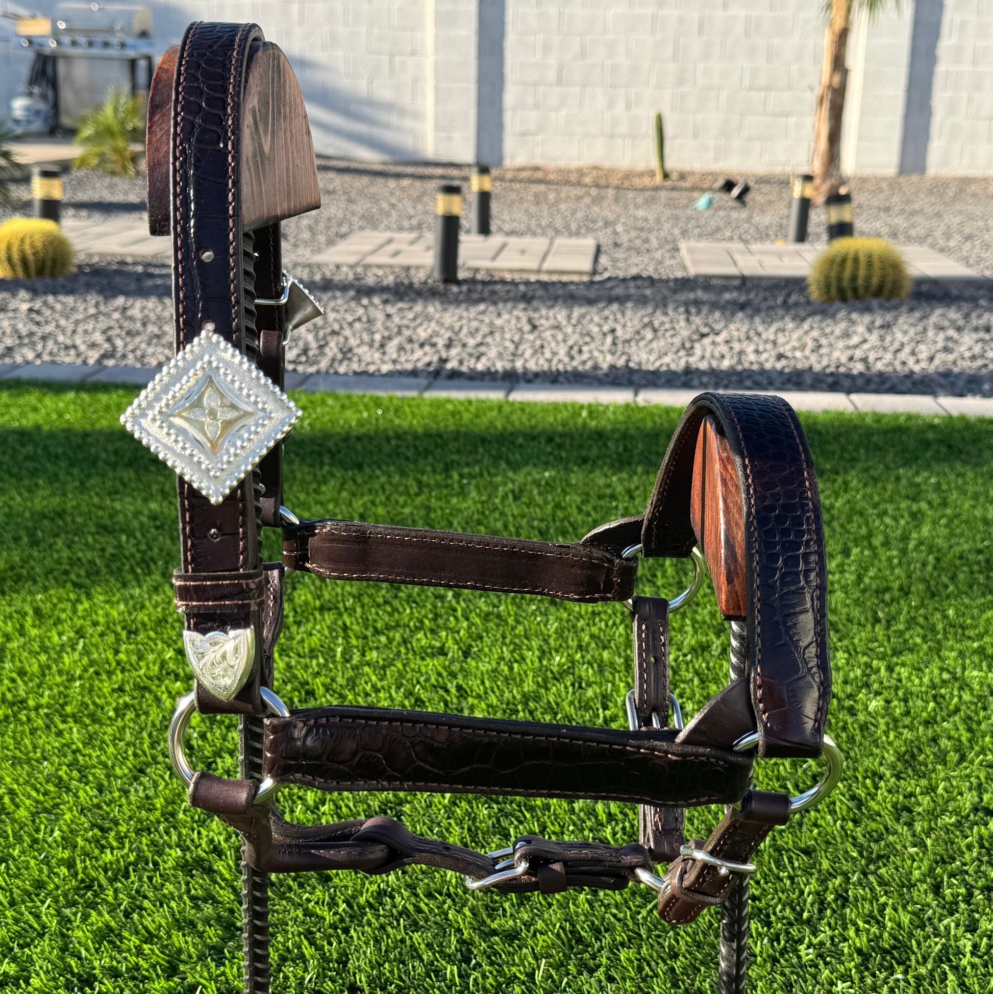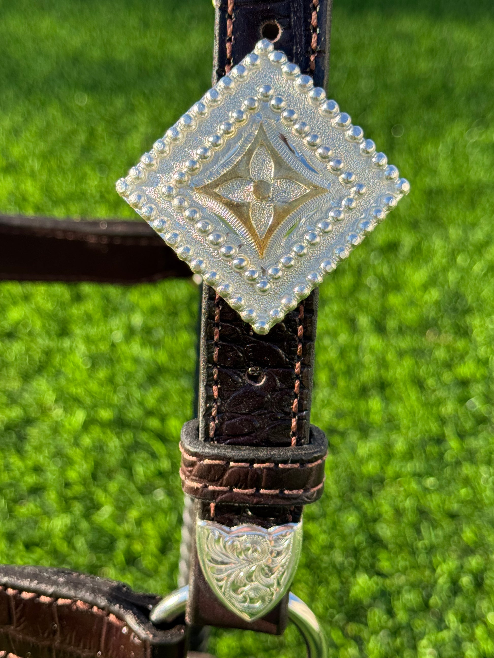 Brown horse size crocodile embossed leather halter with our designer series buckles in silver plate.