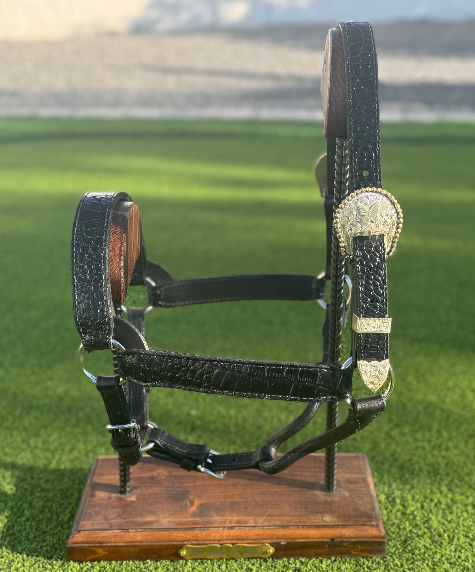 Black large horse size crocodile embossed leather halter with silver overlay butterfly buckles with gold edge berries.