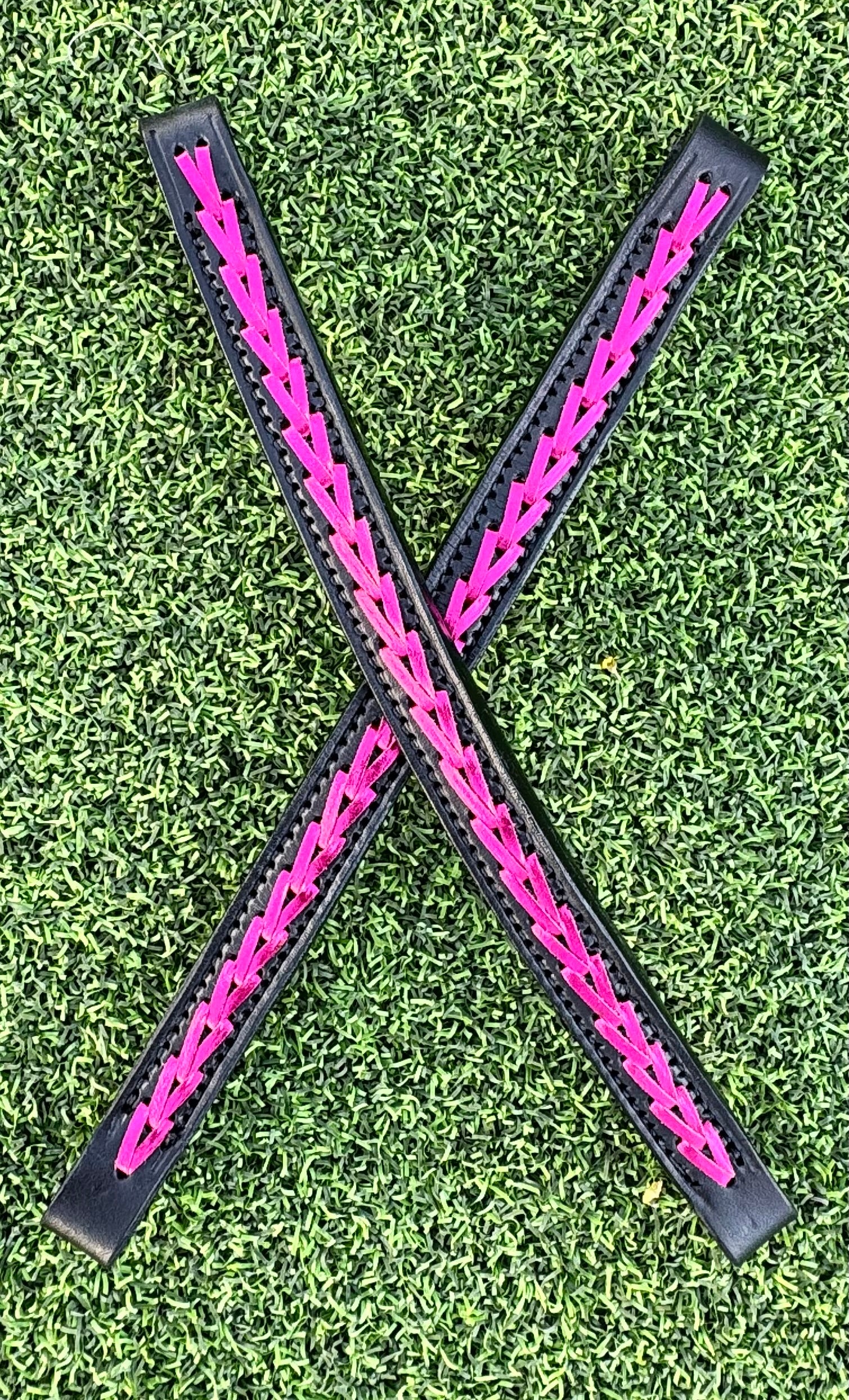 What a fun way to mixup your headstall look with these ear pieces! Black with metallic fuchsia kangaroo lacing. 9.5” long and for a 5/8” headstall.
