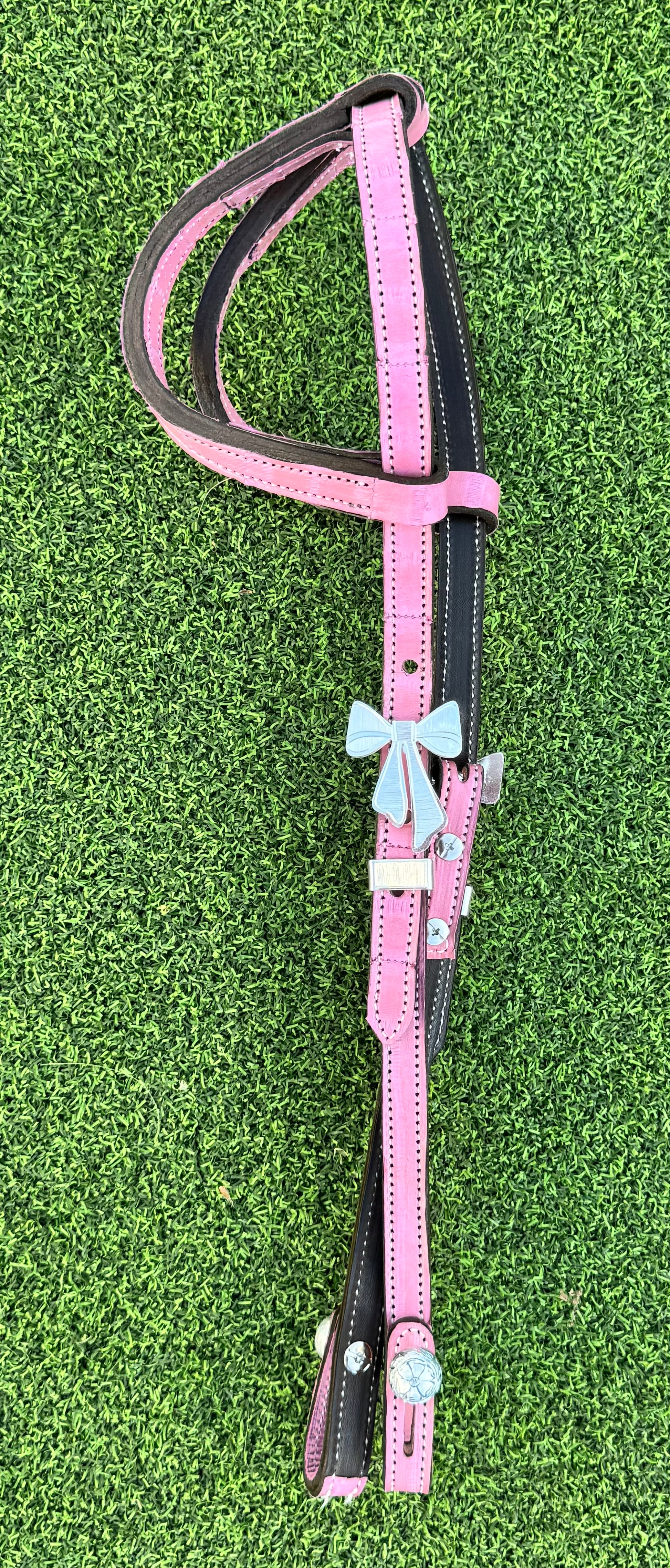 Chocolate Herman Oak leather with dusty pink eel skin overlay. Quick change bit ends and German silver bow buckles. Horse size.