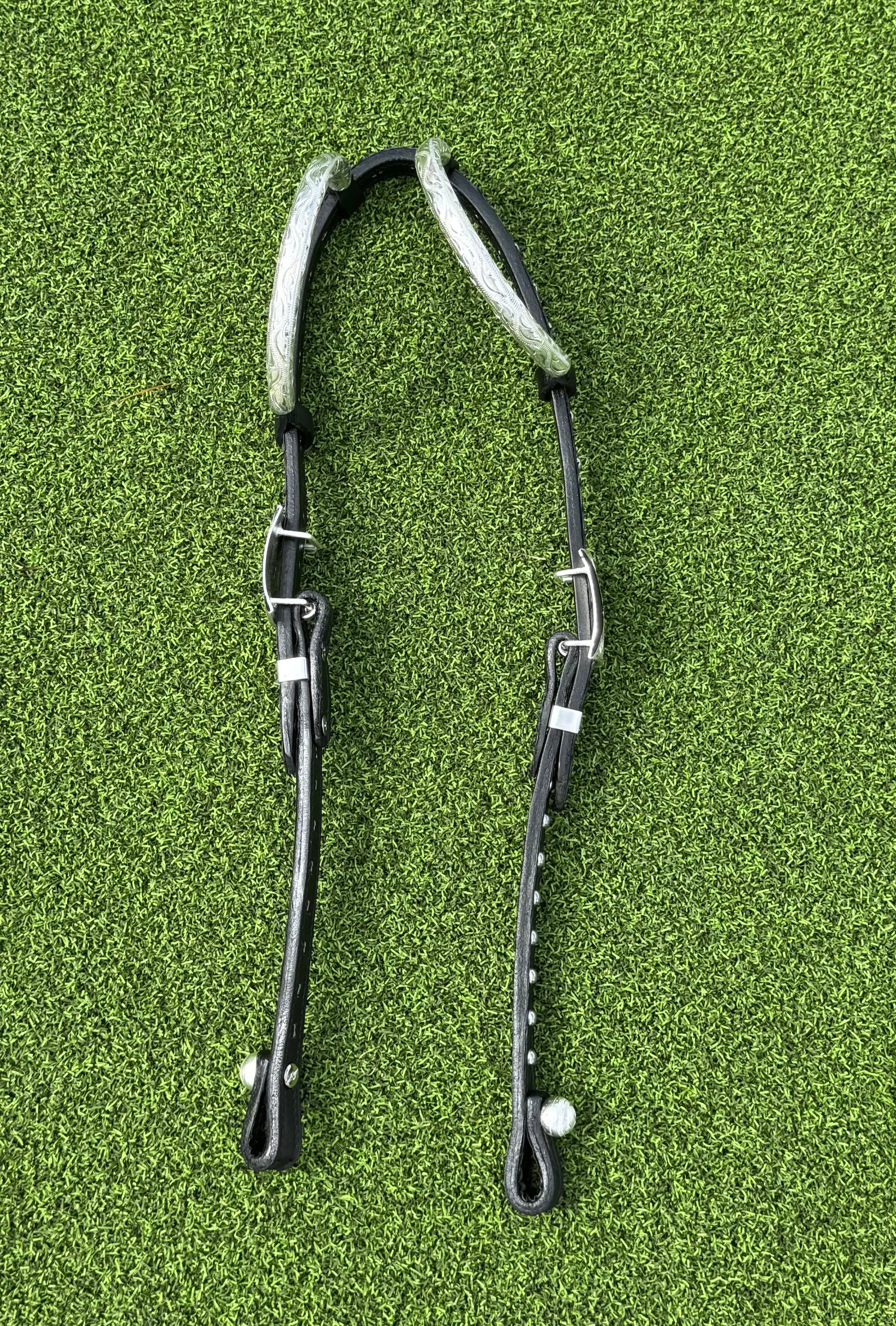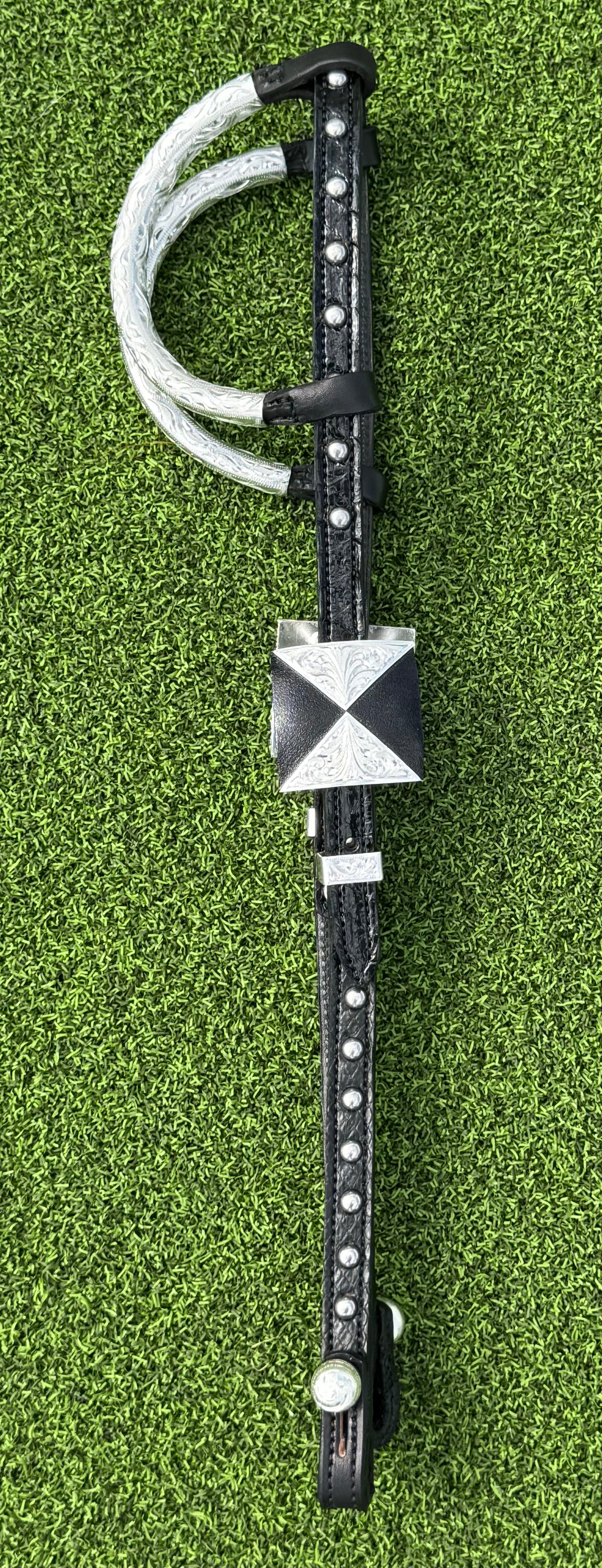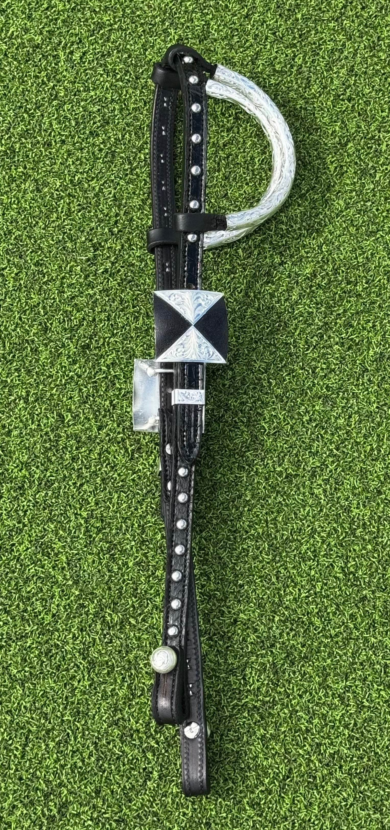 Black Herman Oak leather with black patent python over the crown and black matte python on cheeks.  Stainless steel spots, quick change bit ends and German silver buckles that look like a bow tie from a distance. Last photo shows how sharp these buckles look on. Horse size.