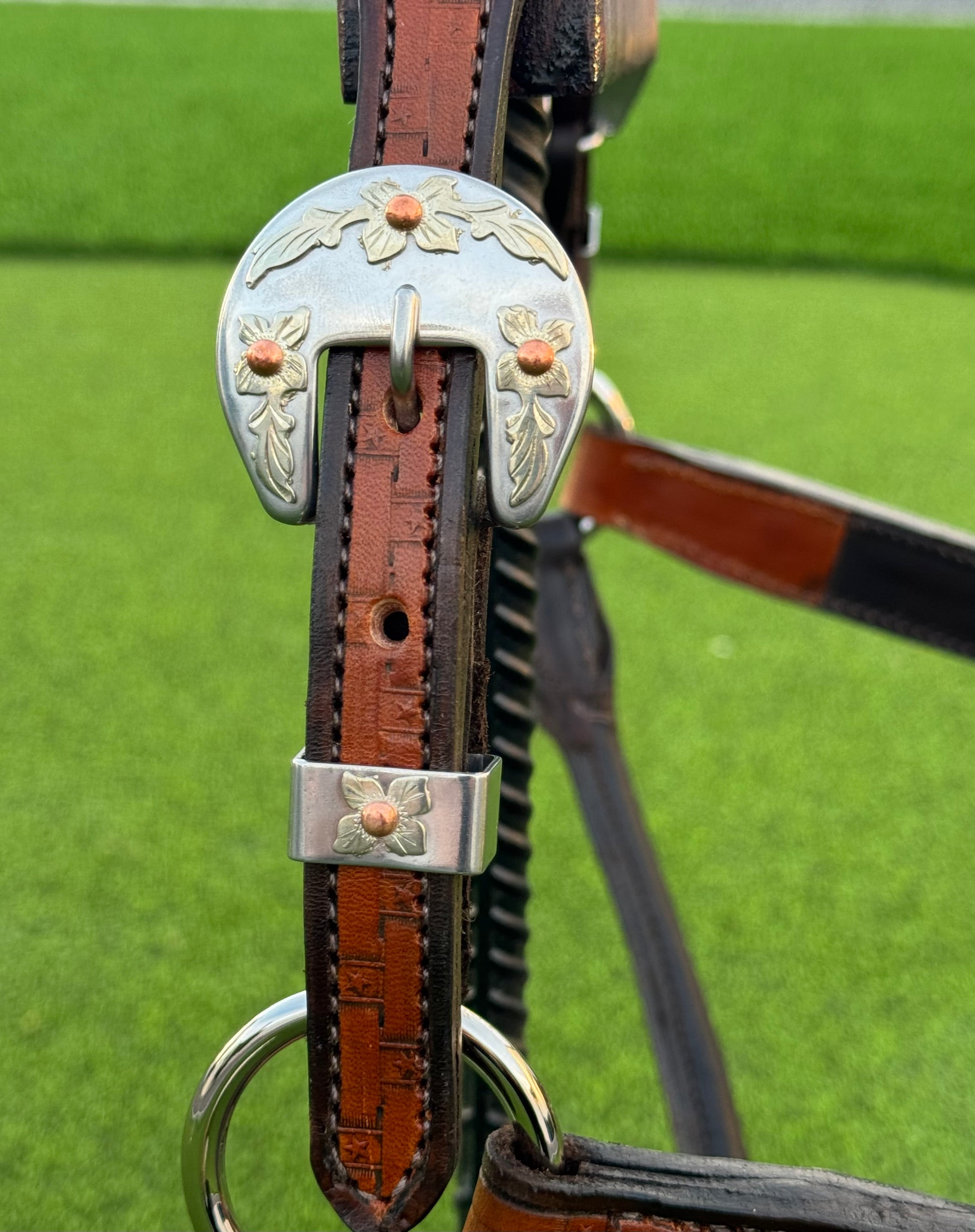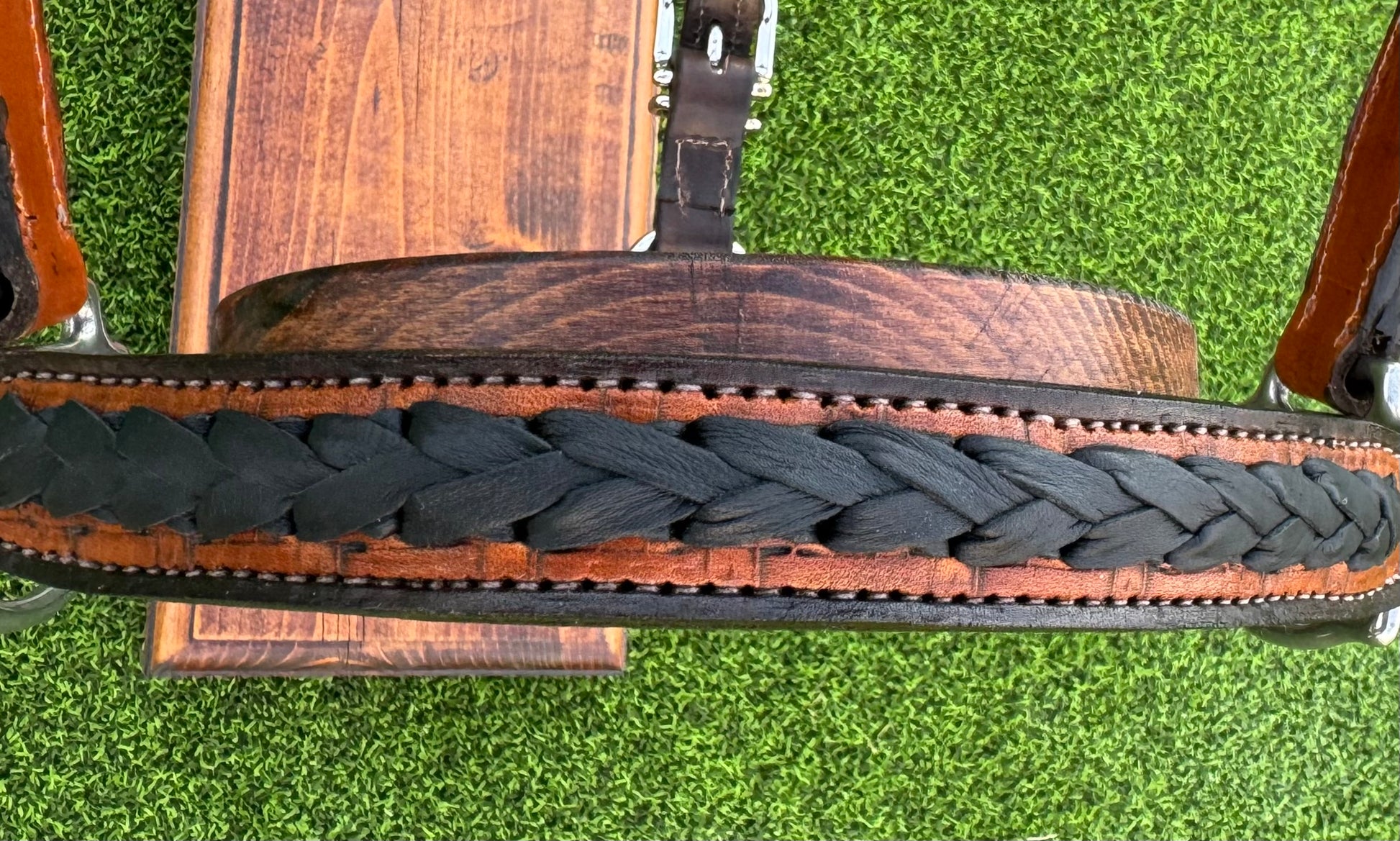 Antique saddle tan and chocolate leather halter with black kangaroo lacing. Make a statement with this ranch halter. Made with the finest materials. Horse size.