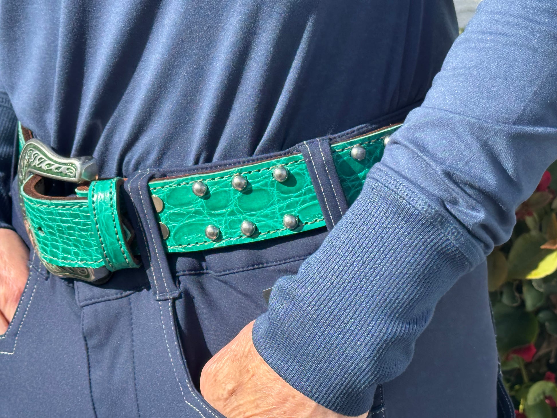 Handmade 1.5” wide western belt. Jade colored genuine crocodile with stainless steel spots. Buckle is changeable so you can also display those lovely trophy buckles. Fits 27”-28” waist.
