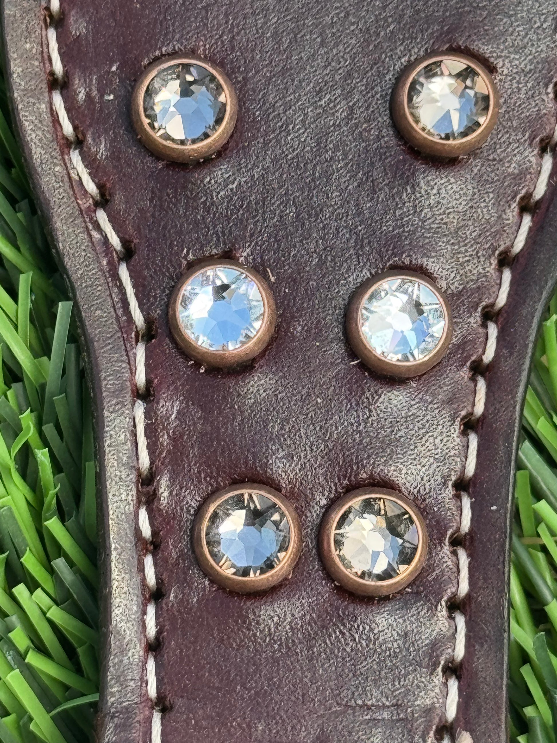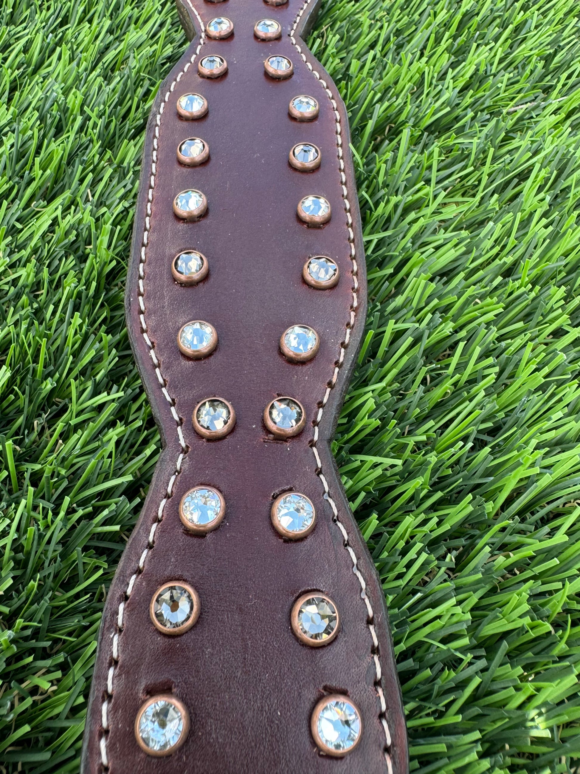Horse size mahogany breastcollar with clear and greige stones and finished off with antique copper hardware and custom made butterfly buckles. Matching headstall can be made!