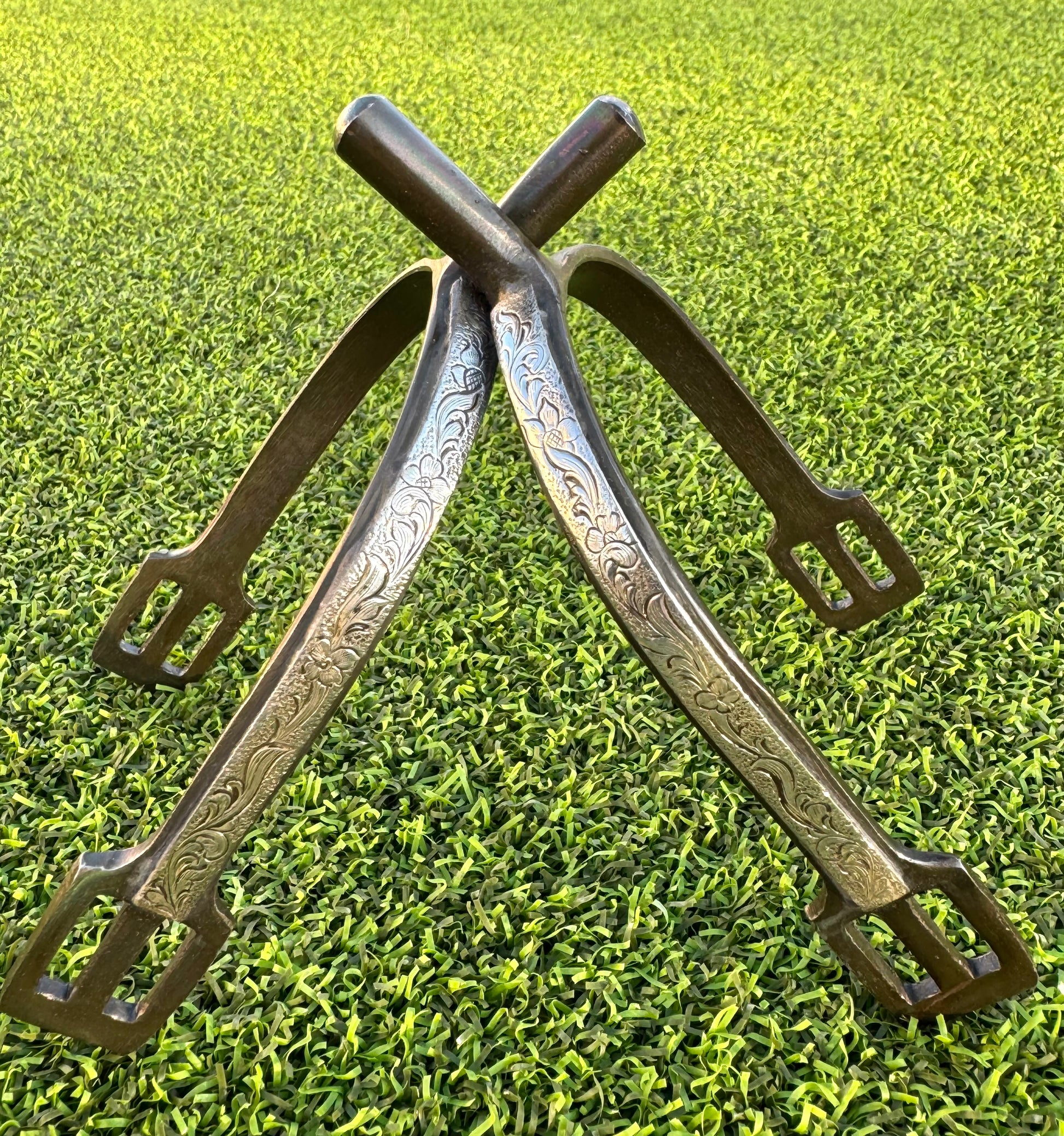 Ladies Black 1" Floral Engraved Silver Prince of Wales English Spurs