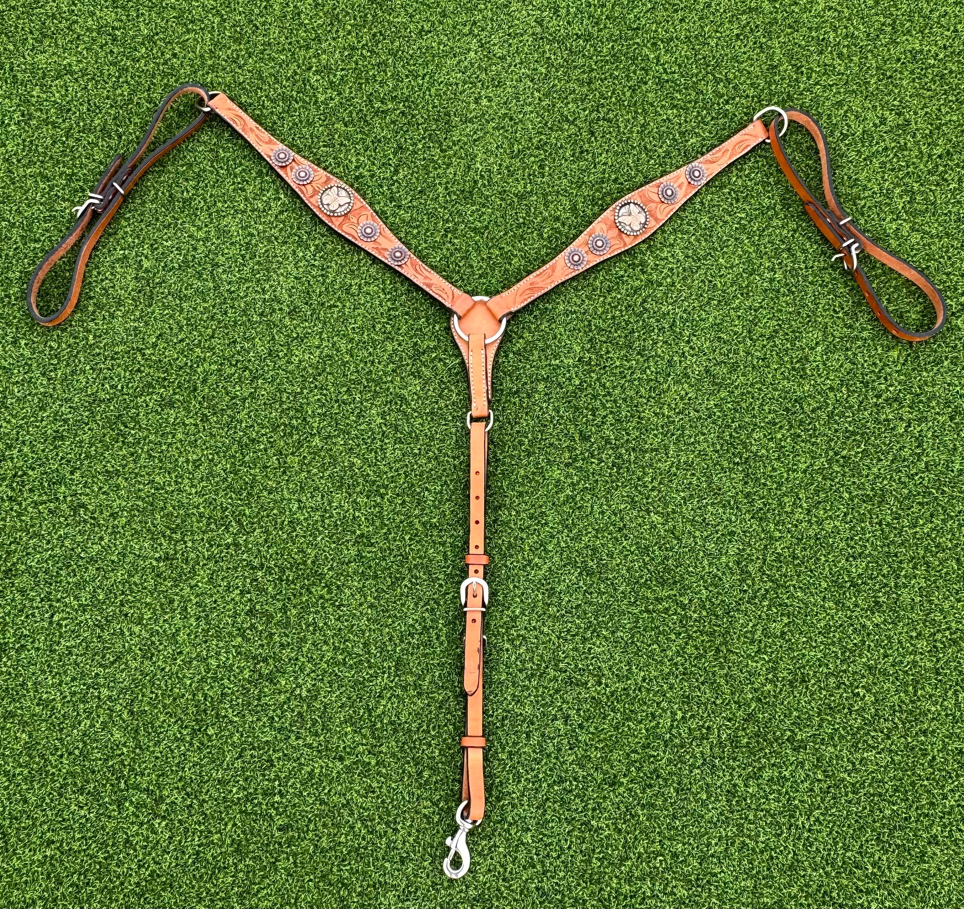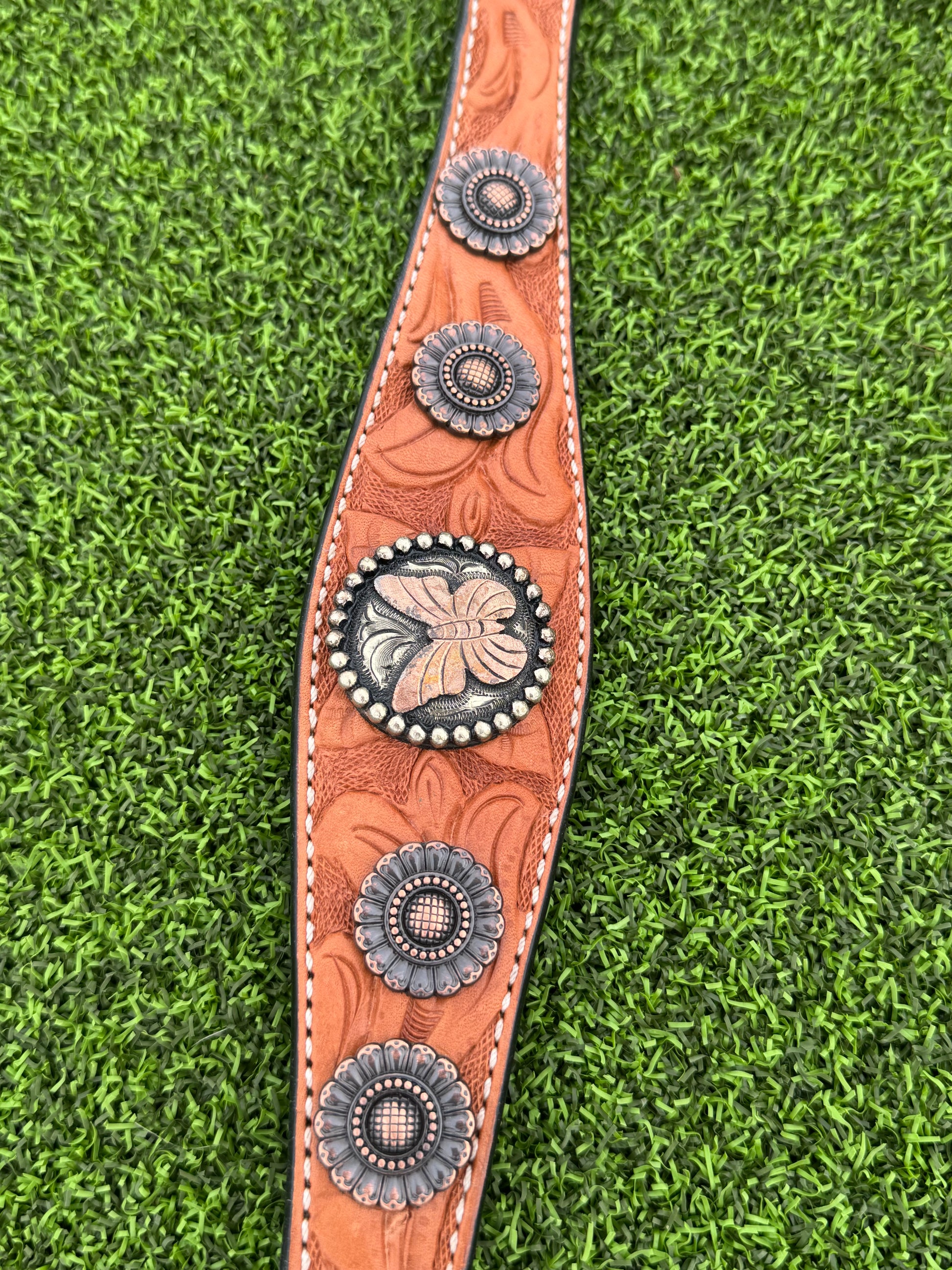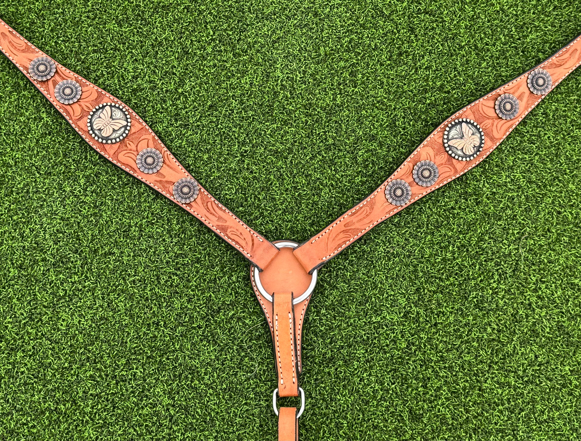 This floral tooled breast collar has custom made antique silver and copper butterfly conchos framed by smaller antique copper flowers. Standard horse size.